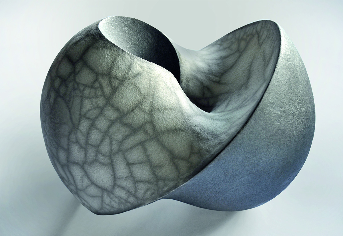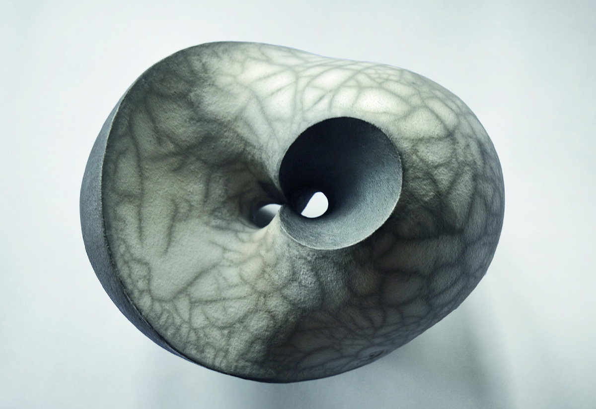 Turning something inside out sounds easy. In most cases it is. For example, you can take off a glove from your right hand, turn it inside out, and put it on your left hand. But what about a sphere? Can you turn it inside out without cutting the surface? Mathematics provides answers. If you overcome small barriers of hought and allow spherical surfaces to cross, bend and stretch, interesting experiments arise. In “Chelo” a certain stage of the inversion is recorded. One presses the sphere together with two impulses at each of the two poles. Not only does the “south pole” become the “north pole” and vice versa. This also creates a lemniscate surface in the center. Through these, both movement impulses can be guided to the other side. At the “equator” there is a diagonal, sharp edge.